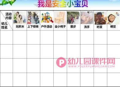 师:老师这里有一幅图(出示“我是安全小宝贝”表格,并张贴在教室的墙上),以后,小朋友们都来比一比,谁得到的笑脸贴纸最多,谁就是我们班的安全小宝贝。