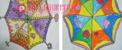 3、教师在活动过程中鼓励幼儿为自己画的伞命名,如果幼儿还不会命名,教师可以帮助幼儿来为自己画的伞命名。