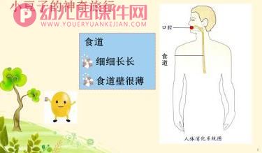 二、通过课件局部演示,进一步知道豆子(食物)旅行的进程,并初步了解口腔、食管、胃、小肠、大肠的作用,进步幼儿的自我保护意识: