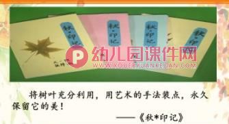 活动延伸:幼儿可尝试用不同的美术形式进行树叶创作,最终将自己的树叶创意作品装订成画册——课件PPT《秋*印记》。