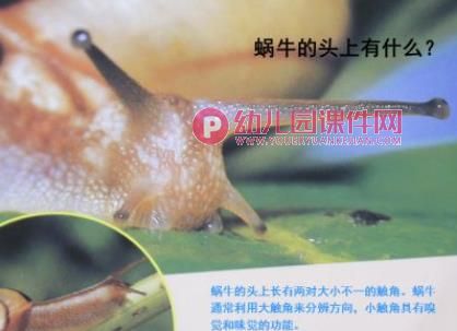 (2) 认识蜗牛的触角、头、壳和腹足,知道蜗牛是世界上爬行最慢的动物,也是世界上牙齿最多的动物。