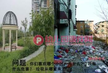 1.观看短片1、2:(垃圾为什么要回不同的"家"?怎样才能回不同的"家"?)师:(点击第二朵花)下面我们继续共同研究--垃圾为什么要回不同的"家"吗?怎样才能回到不同的"家"?有谁能说一说?