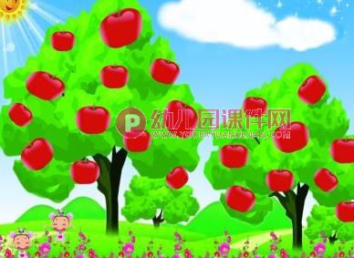 ——开呀开,果园到了。哇,一排排的果树上挂着什么呀?有红彤彤的大苹果树、黄橙橙的梨树、甜甜的桔子树,还有柿子树。。。。(出示ppt),它们都是秋天的水果。