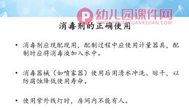本文为保育员消毒知识培训PPT课件,保育员消毒知识培训PPT课件主要包含了PPT课件,消毒原则,日常消毒要点,空气的消毒,教室(活动室)物表消毒,七步洗手法,玩具和用具消毒等内容,欢迎点击。适用于保育员消毒知识培训相关的教学实践,所属栏目幼儿园培训PPT。
