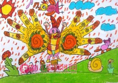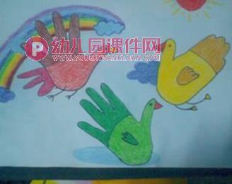 二、欣赏手形画师:今天老师还带来几幅漂亮的手形画。(出示PPT图片,请幼儿欣赏,老师指导幼儿观察这些漂亮的手形画是由什么手形变成的。