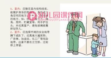 b、在室内的幼儿,应立即就近躲避,身体采用卧倒或蹲下的方式,使身体尽量小,躲到桌下或墙角,以保护身体被砸,但不要靠近窗口。