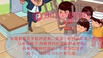 (2)教师总结。如果碰到坏人闯入幼儿园,我们不要害怕,要保持冷静,进来那个不要让坏人发现。如果坏人离你比较远,你可以跑去告诉老师或者保安;如果坏人离你比较近,你要想办法找个安全的地方躲起来,就像这个小朋友一样。总之,遇到坏人,保护自己的生命安全最重要。