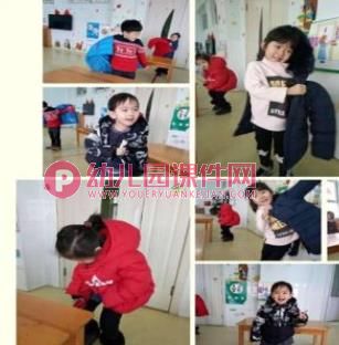 师小结:小朋友和小花熊一样能干,大多数小朋友在幼儿园不要老师穿衣,只有个别小朋友老师帮一下忙他也会穿了,有的小朋友甚至还帮助其他小朋友。 过渡语:刚才去了小熊家,现在想不想去小朋友家看看?