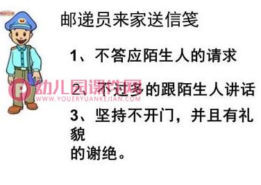 教师小结:小朋友们刚才说的都非常好,一个人独自在家时不能随便开门,不能随便相信不认识的人的话,不认识的人叫“陌生人”,对“陌生人”要小心警惕。