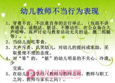 本文为幼儿园师德安全培训PPT课件,幼儿园师德安全培训PPT课件主要包含了师德缺失案例,体罚及变相体罚的危害,幼儿教师师德缺失的具体体现,幼儿教师不当行为表现,幼师应有的行为等内容,欢迎点击。适用于师德安全相关的教学实践,所属栏目幼儿园培训PPT。